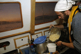 Courant de face dû à la marée, prés de 60 milles parcouru au bout de 36 heures, la navigation s'organise autour des phases d'effort et de récupération des sportifs. Entre 6 et 8 heures de pédalage nocturnes, 4 à 5 heures de repos jusqu'au lever du soleil puis reprise de l'effort dans la matinée. Alex et Julien prennent le leur repos durant les heures les plus chaudes de la journée pour une douzaine d'heures de pédalages par jour en moyenne. A bord les quarts sont pris à trois, un barreur, une vigie qui surveille en permanence le vtt des mers et un équipier chargé de faire les relever sur la carte ou le café... Des cycles de trois heures durant lesquels sont assurés le ravitaillement et les instructions de navigations des deux sportifs.